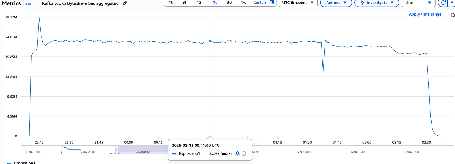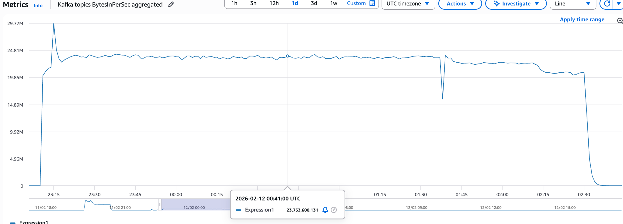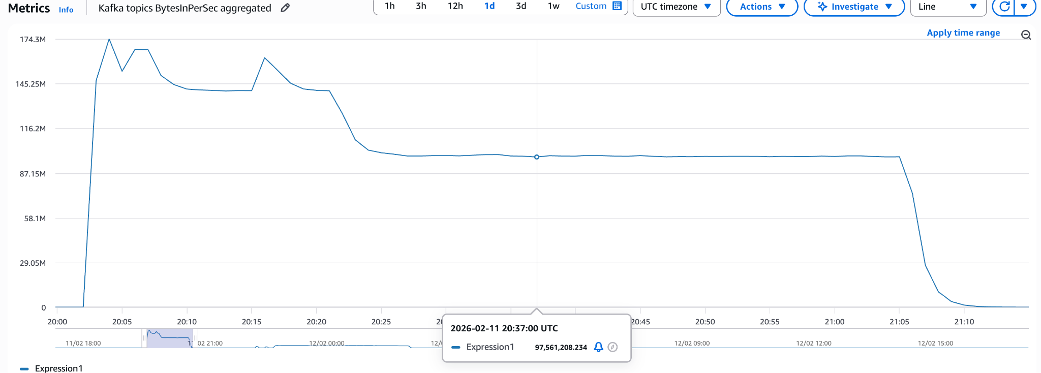 AWS MSK with 3 express.m7g.xlarge brokers.