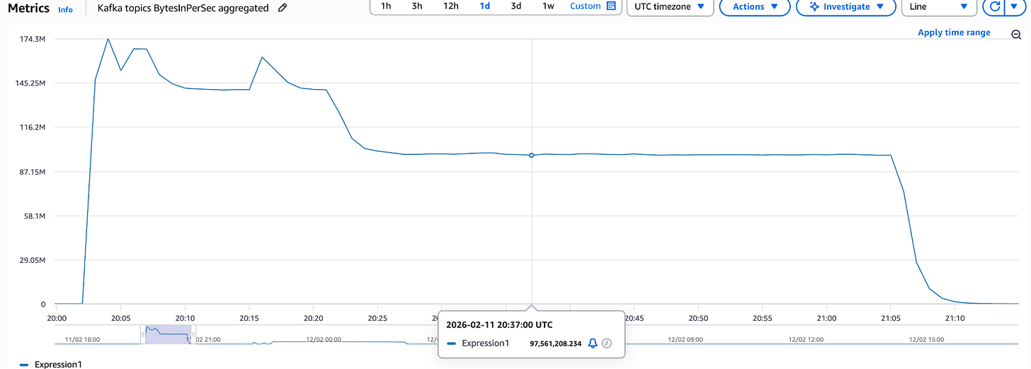 I tried the same obvious optimization with tweaking the Kafka Producer configuration: using linger.ms of 100 and batch.size of 1000000. This time, it was beneficial: I was able to nearly double the throughput and consistently achieve 100 MB/s after ramping up