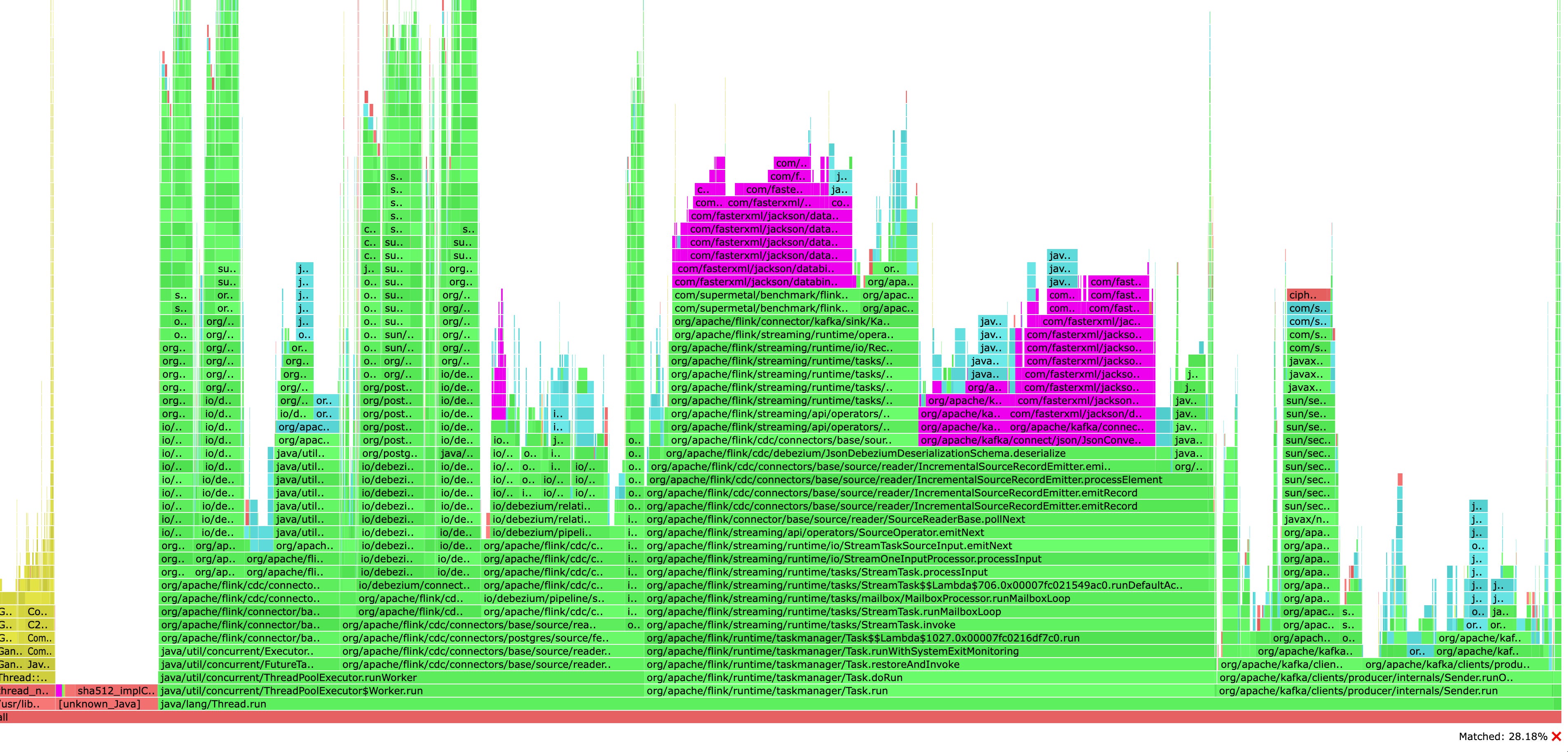 Purple color highlights JSON serialization/deserialization, which takes almost a third of the CPU. In general, when it comes to stateless streaming systems, data serialization/deserialization is the slowest part. This is especially evident here, since the data goes through a few serialization/deserialization roundtrips (first in Debezium, then in Flink). Jackson, the heavily used Java JSON library, is not the fastest out there. If you’re dealing with JSON in a high-performance Java system, check fastjson2 and simdjson-java.