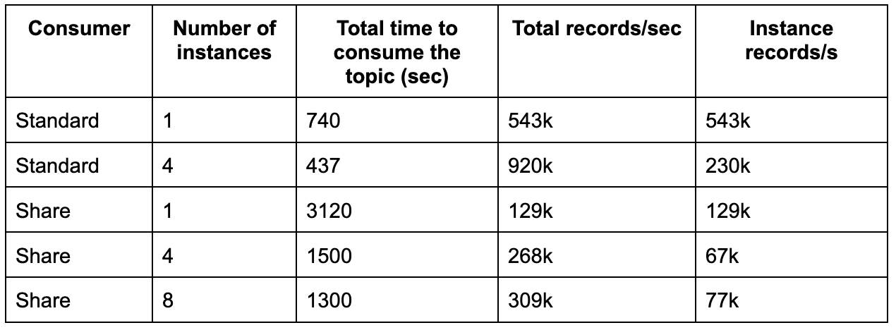 The throughput of the new share consumer is dramatically lower. We can definitely see the improvement when adding more instances, but the difference is still brutal: even eight instances of the share consumer are slower than a single standard one.