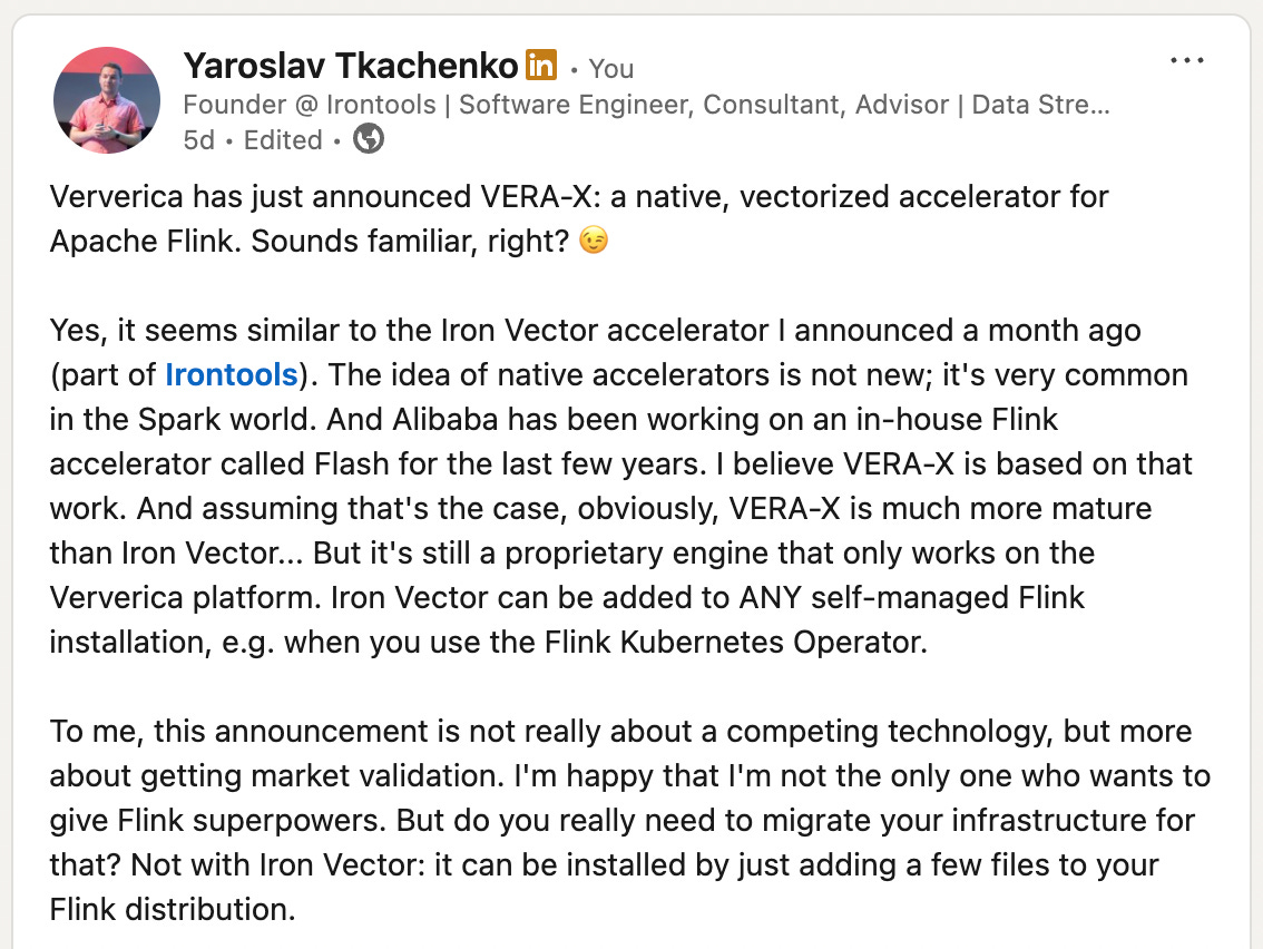 I’m really excited about this direction. People have tried to replace Flink with new stream-processing engines, but they haven’t succeeded. I think Iron Vector or VERA-X is a healthier approach to getting a significant runtime upgrade.